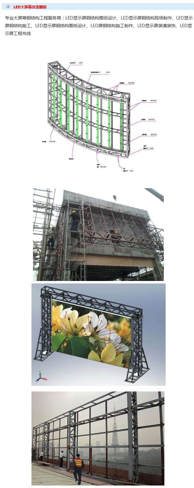 戶外廣告牌、樓頂廣告牌、精神堡壘、地產圍擋、亞克力吸塑燈箱、大型雕刻、地產圍墻廣告、LED單色及全彩顯示屏工程、夜景工程、大型標牌、室內外高清噴繪寫真等。